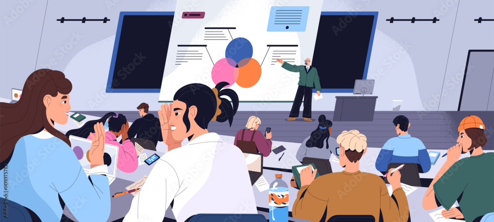 Canvas Print Professor explains diagrams at the whiteboard to chatting students in auditorium