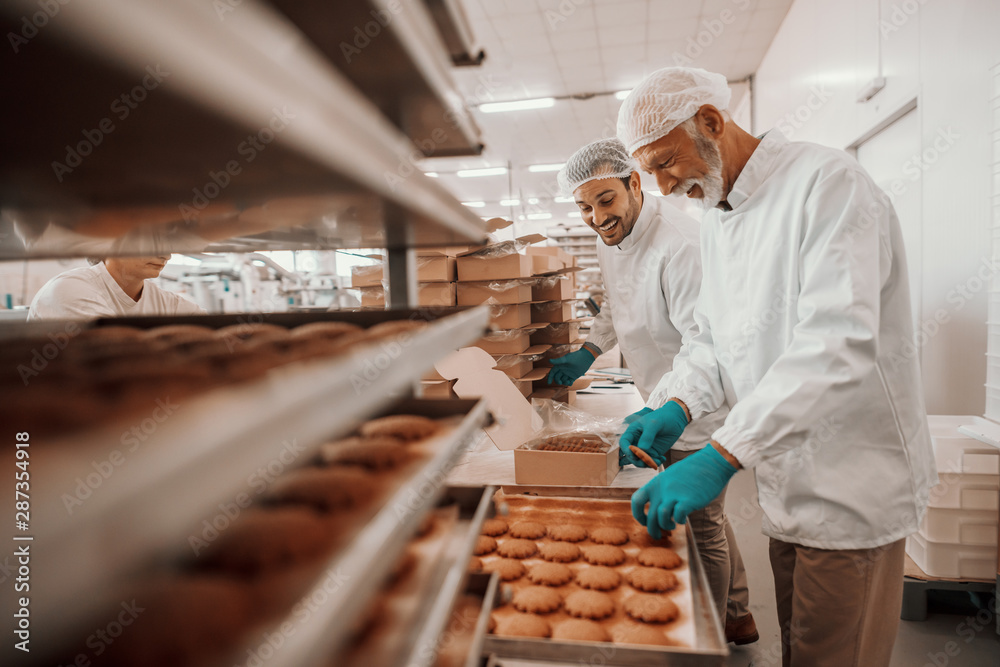 Canvas Print Two hardworking dedicated Caucasian employees dressed in white sterile uniforms collecting and packing cookies in boxes