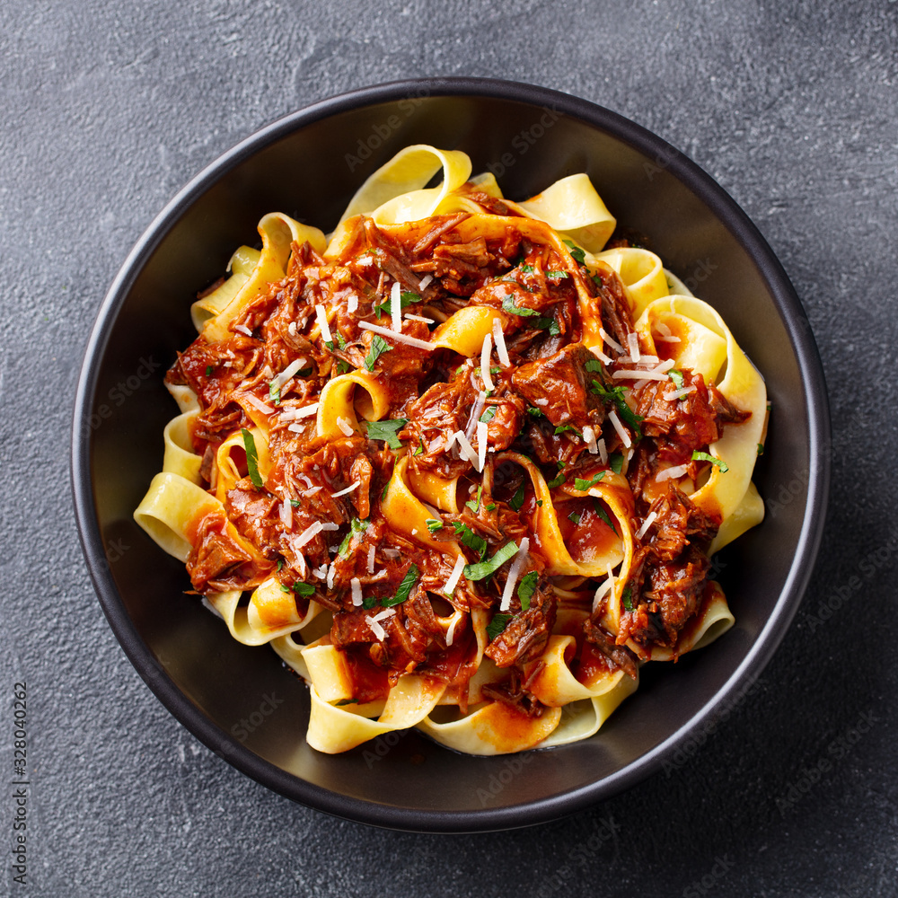 Canvas Print Pasta pappardelle with beef ragout sauce in black bowl