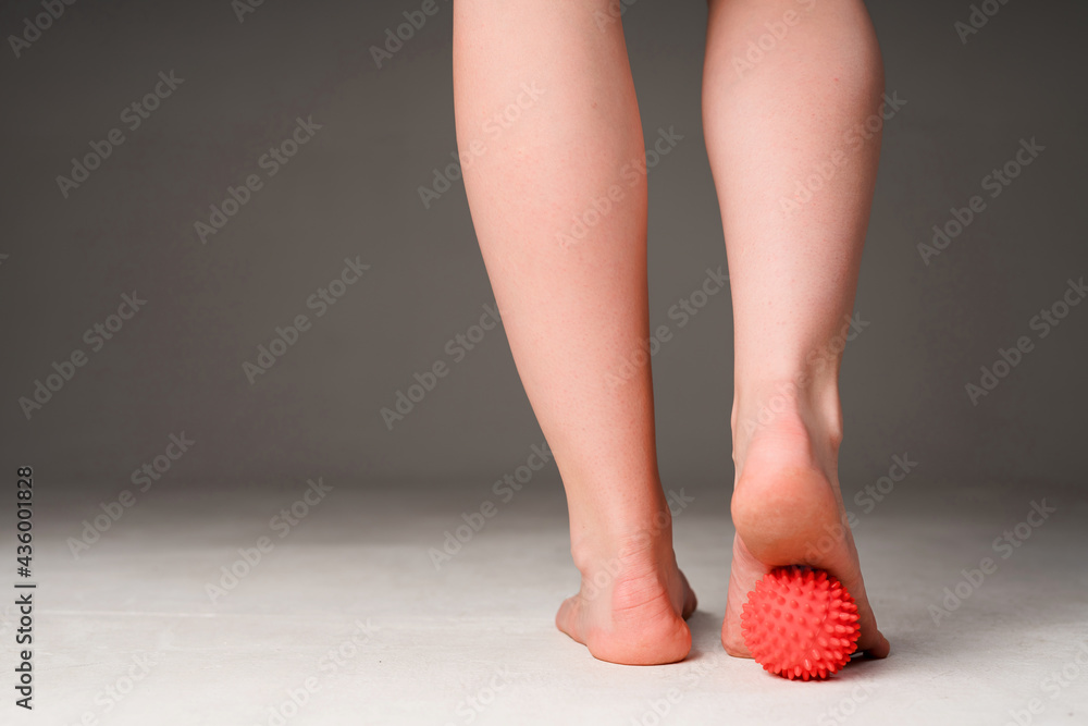 Canvas Print Photo of female legs kneading feet with a massage ball and doing exercises with