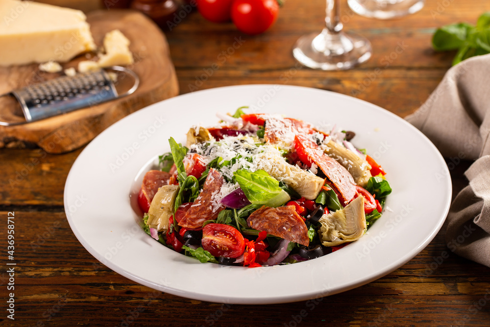 Canvas Print Italian antipasto salad with salami, artichoke hearts and olives