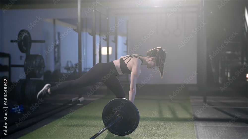 Canvas Print Fitness woman train landmine single leg romanian dead lift with barbell