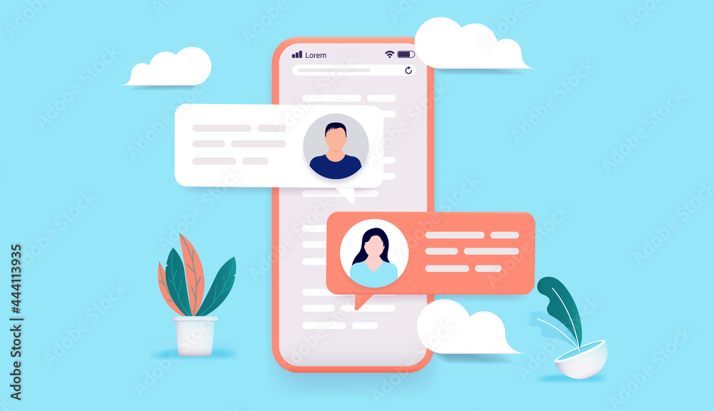 Canvas Print Man and woman texting - Smartphone with text chat messages popping out, showing profile pictures