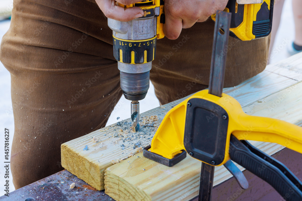Photography Metalworker uses drill to create holes in wooden planks while working at constru