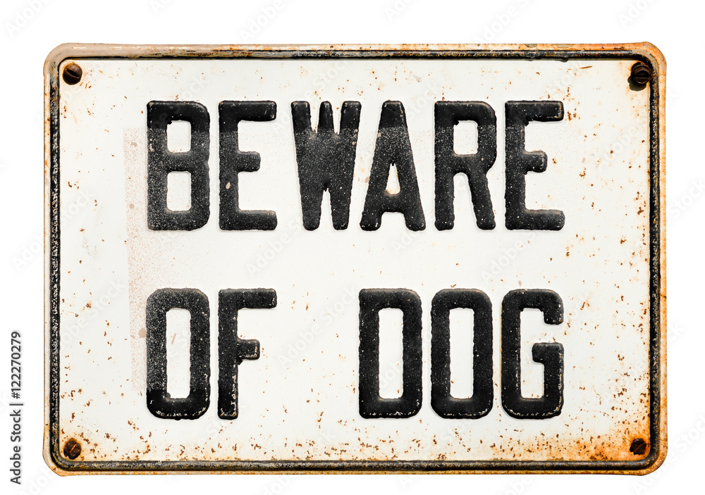 Photography Rusted metal tin Beware Of Dog sign placcard isolated on white background