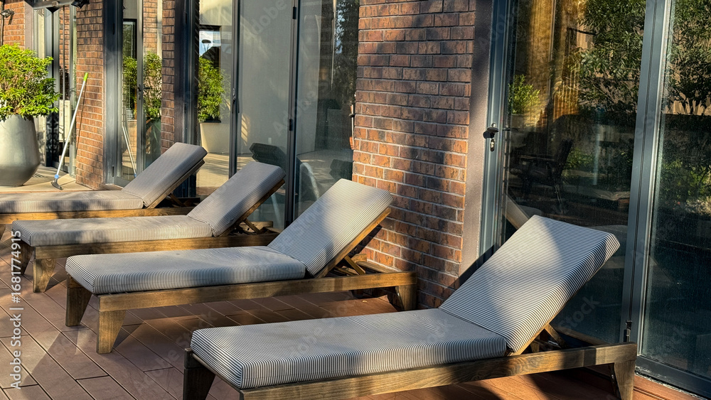 Photography Sunlit, empty loungers whisper languid tales of siesta, casting shadows for Sols
