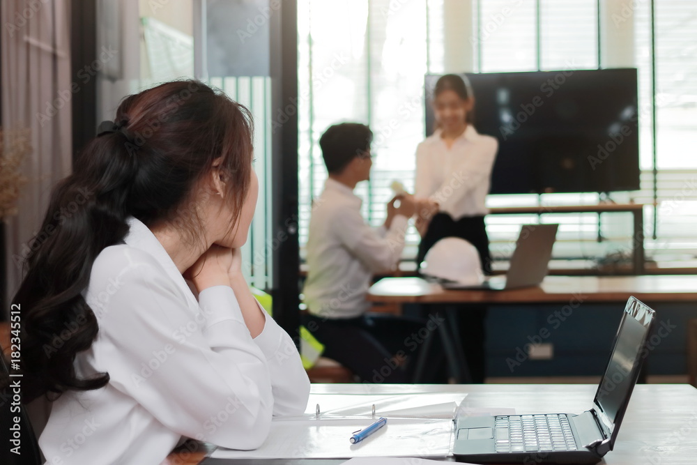 Photography Envious angry Asian business woman looking affectionate couple in love in office