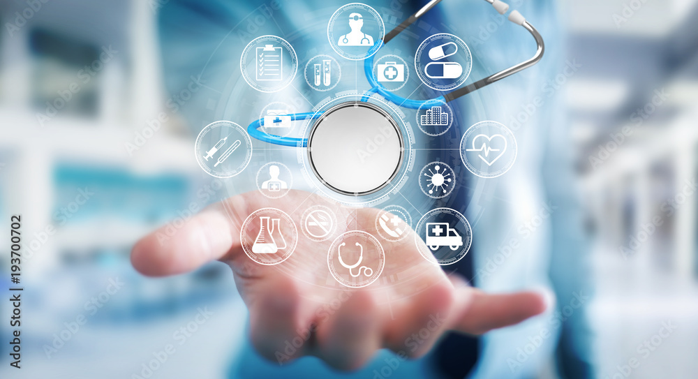 Photography Businessman holding and touching floating stethoscope 3D rendering