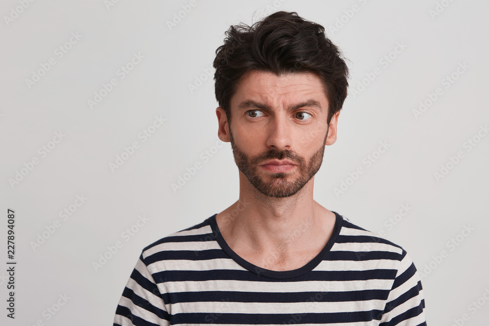 Photography Young man with dark brown hair and beard wears black and white striped casual ts
