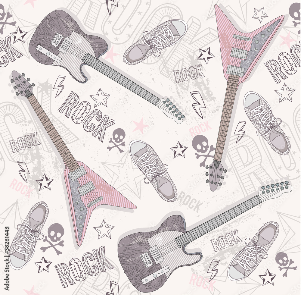 Photography Cute grunge abstract pattern. Seamless pattern with guitars, sho
