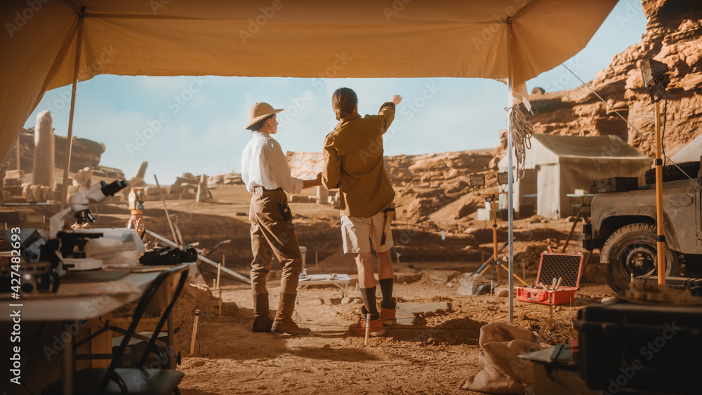 Photography Archaeological Digging Site: Two Great Archeologists Work on Excavation Site, Look around, Use Map to Inspect Newly Discovered Ancient Civilization Architectural Site, Planning Work