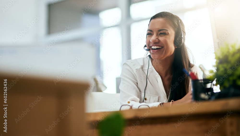 Photography Laughing, virtual assistant or happy woman in call center consulting, speaking or talking at help desk
