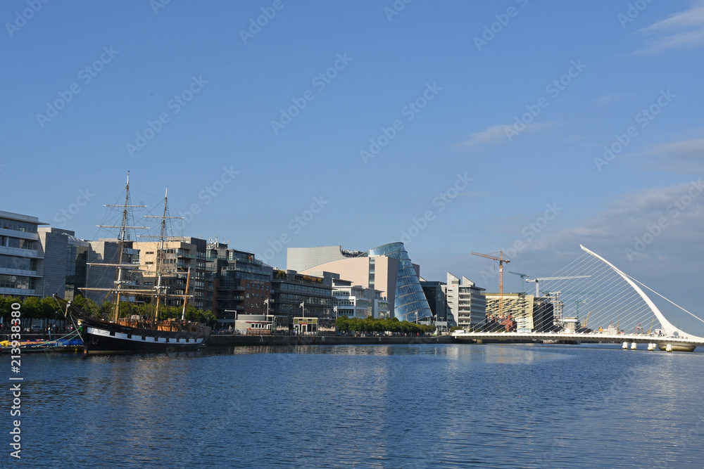 Canvas Print Sailing ship on River Liffey, Samuel Beckett Bridge and CCD in Dublin, Ireland