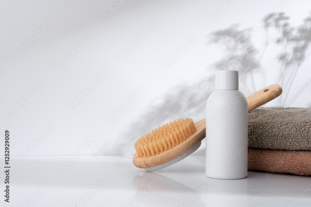 Sticker Skincare bottle, wooden body brush, and towels on a white surface