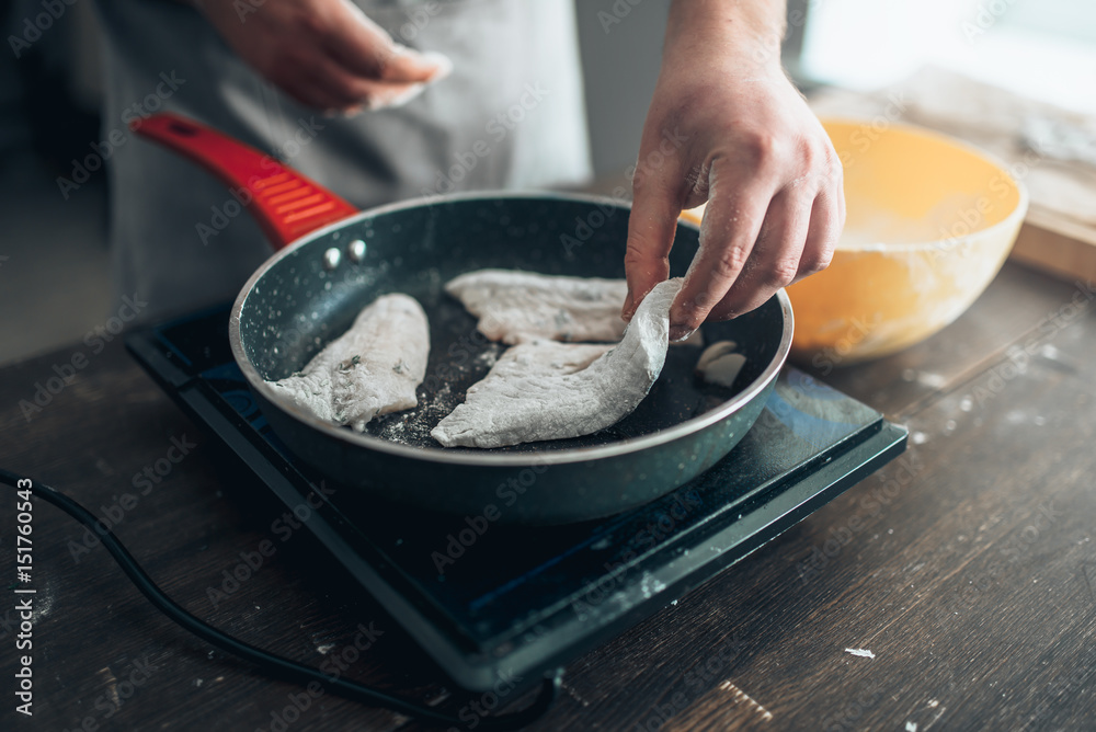 Sticker Chef cooking sea bass fish fillet on a frying pan