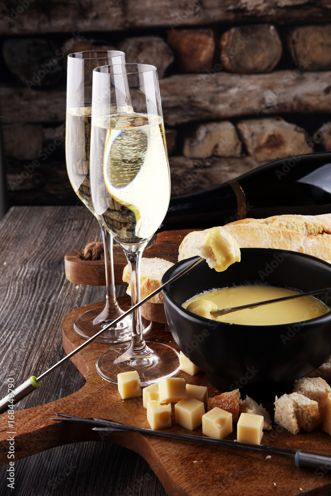 Sticker Gourmet Swiss fondue dinner on a winter evening with assorted ch