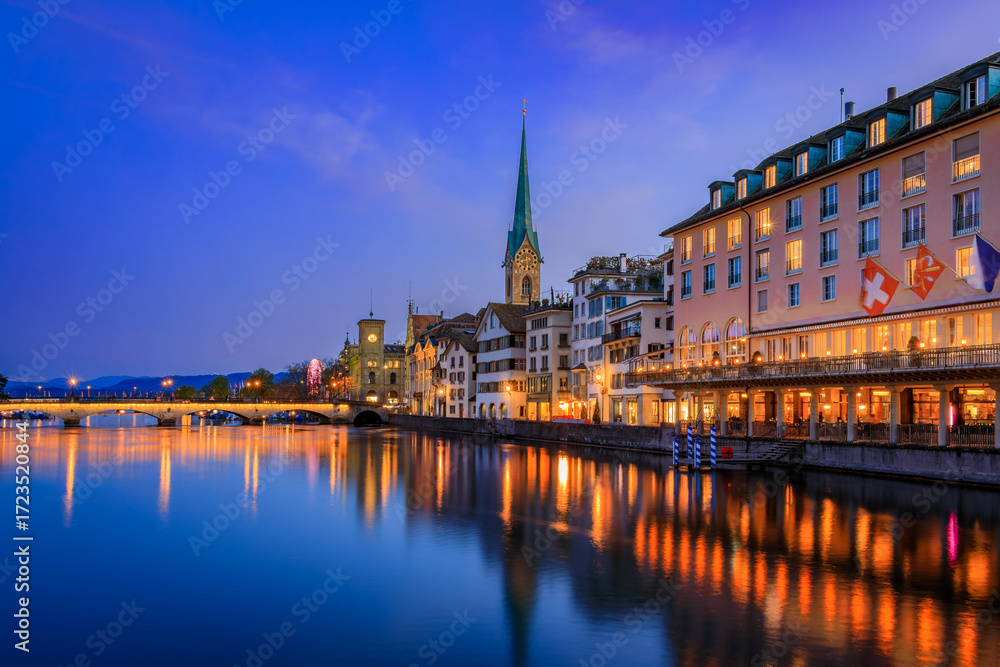 Sticker Cityscape with the iconic Fraumunster church and classic buildings on the banks