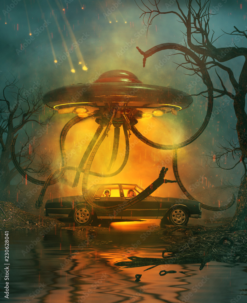 Sticker A family with a car broken down on a secluded forest at night with an attack of