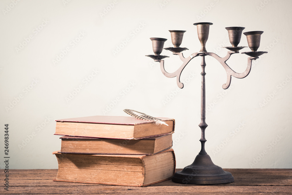 Sticker still photography : stack of old book with feather pen and candelabrum on old wo