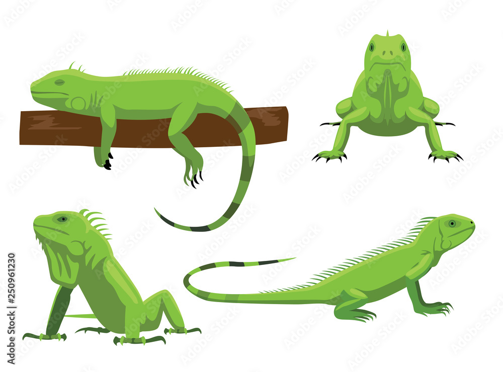 Sticker Cute Green Iguana Poses Cartoon Vector Illustration