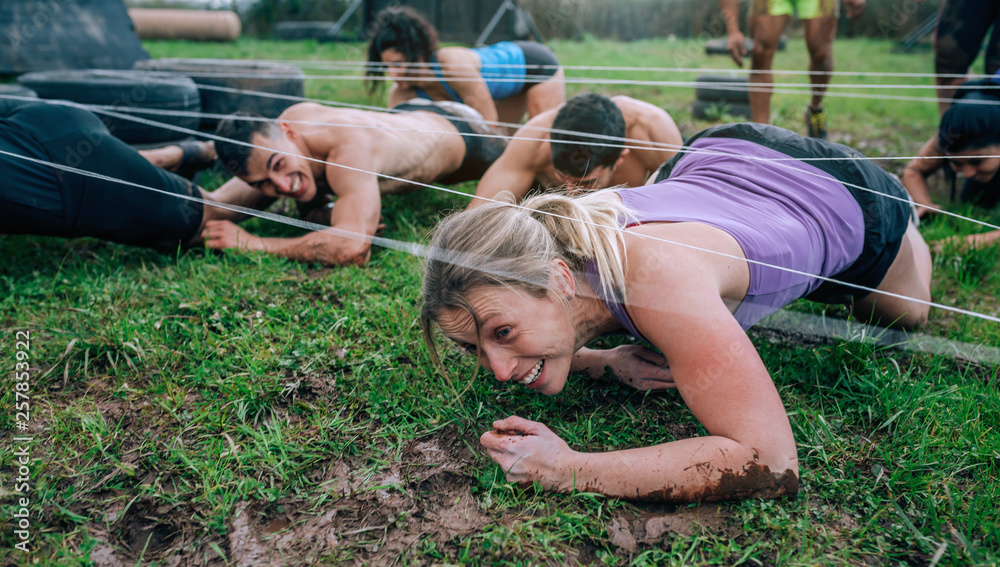 Sticker Group of participants in an obstacle course crawling under electrified cables