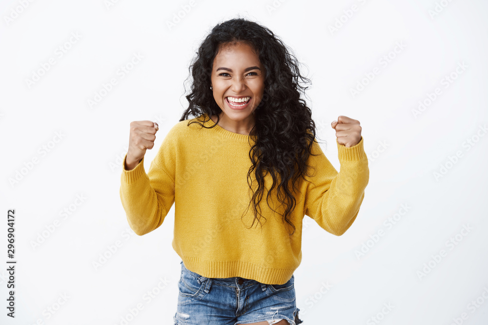 Sticker Encouraged and motivated cute african-american woman in yellow sweater raising h