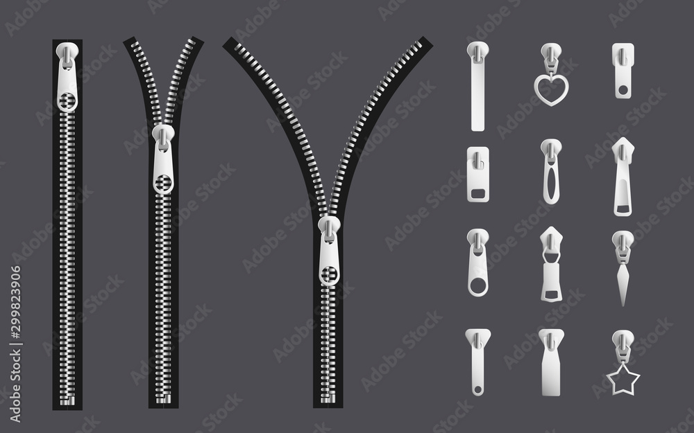 Sticker Opening and closed zipper and its parts - silver metal fabric fastener