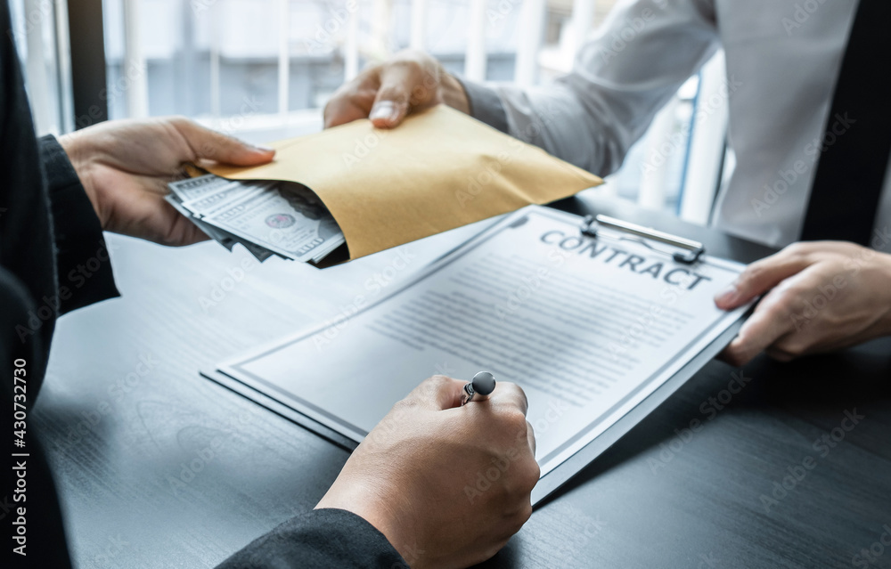Sticker Dishonest cheating in business illegal money, Business woman giving bribe money