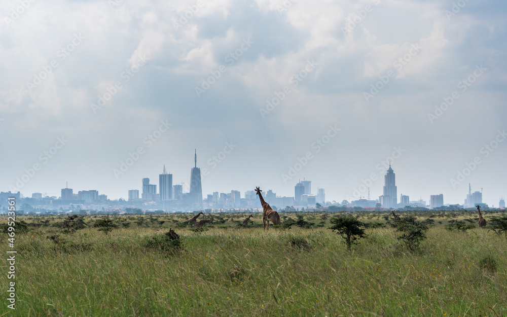 Sticker Giraffes with Nairobi’s skyline in the background, a unique view from Nairobi National Park