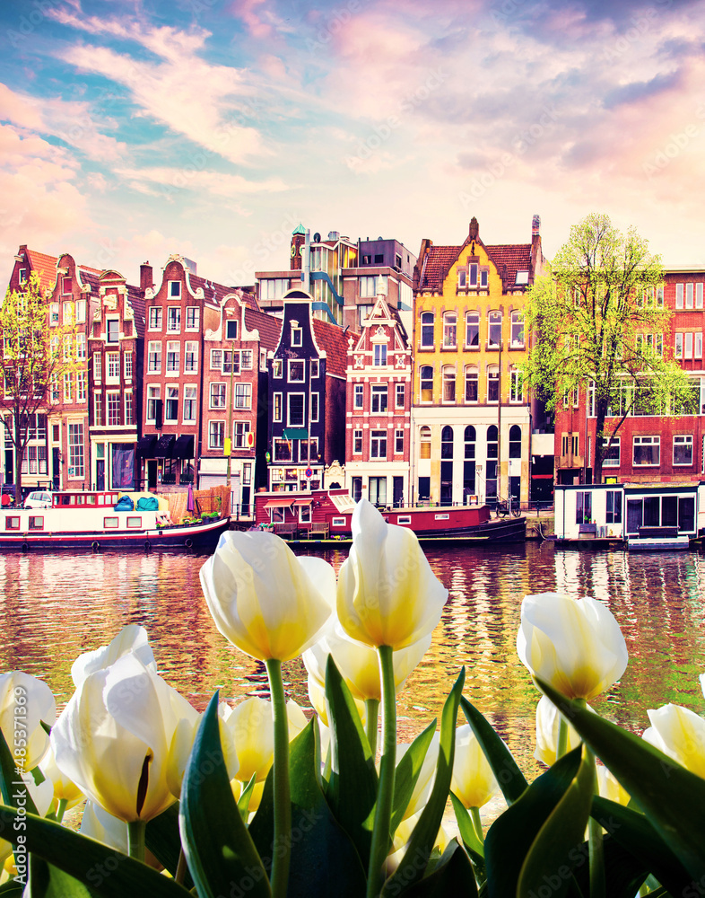 Sticker Beautiful landscape with tulips and houses in Amsterdam, Holland (greeting card