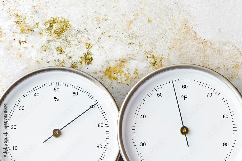 Sticker Wall overgrown with mold or mildew with analog thermometer indicating 56 degrees FAHRENHEIT and a hygrometer measuring 70 percent relative humidity