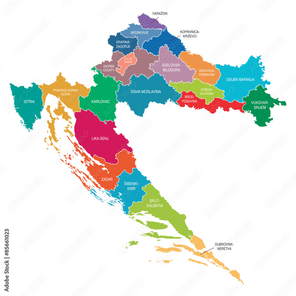 Sticker Croatia Map with Regions Colored Vector Illustration