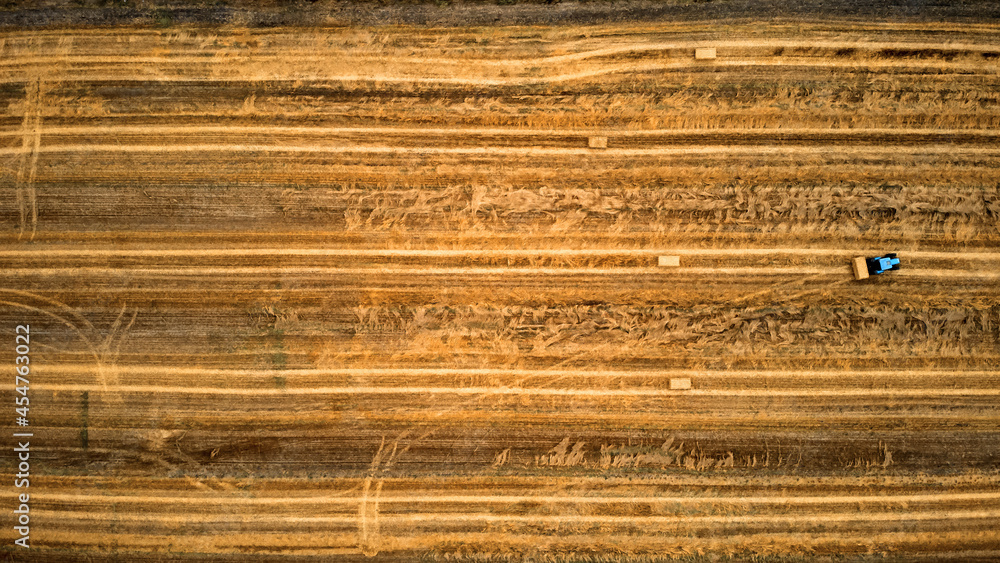 Canvas Print Tractor working on a farm and collecting hale straw bales.