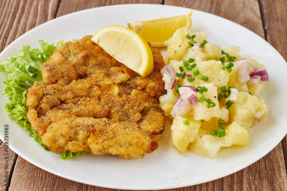 Wall Mural Weiner schnitzel with potato salad on a wooden background