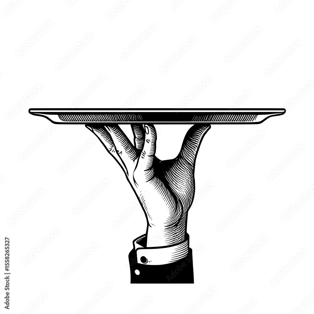 Wall Mural waiter holding tray , a hand in suit holding a tray in black and white art tran