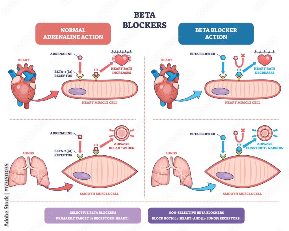 Wall Mural Beta blockers diagram shows how these drugs reduce heart rate and constrict airways by blocking beta receptors in heart and lungs