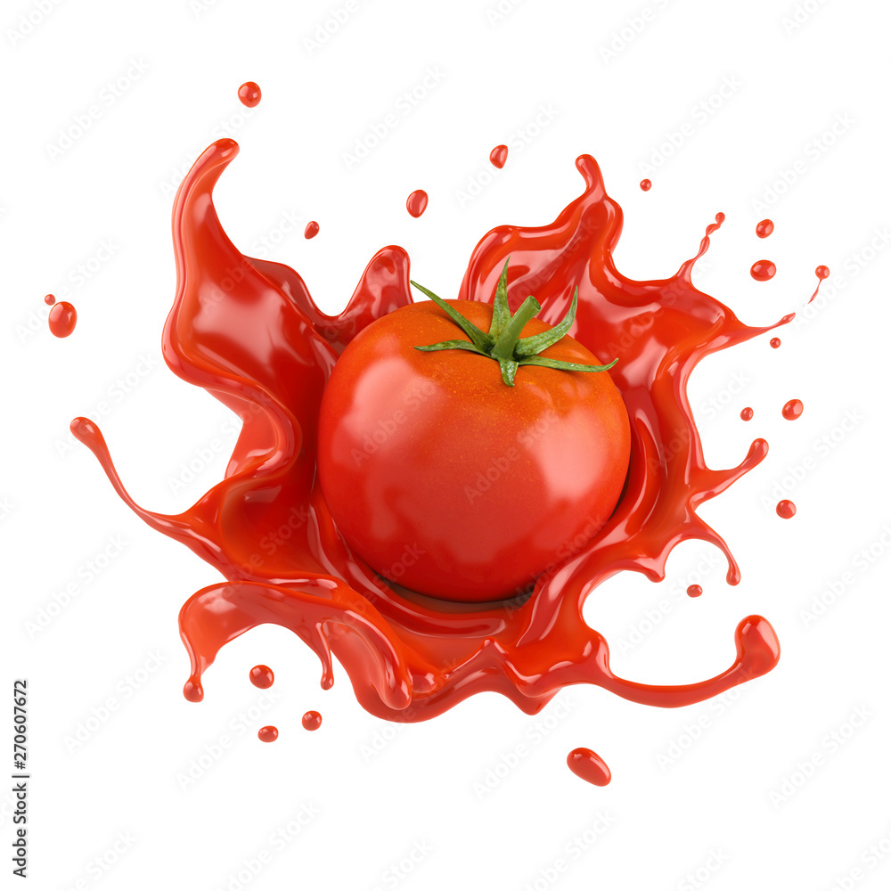 Wall Mural Red tomato with juice or ketchup splash isolated on white background,3d rendering