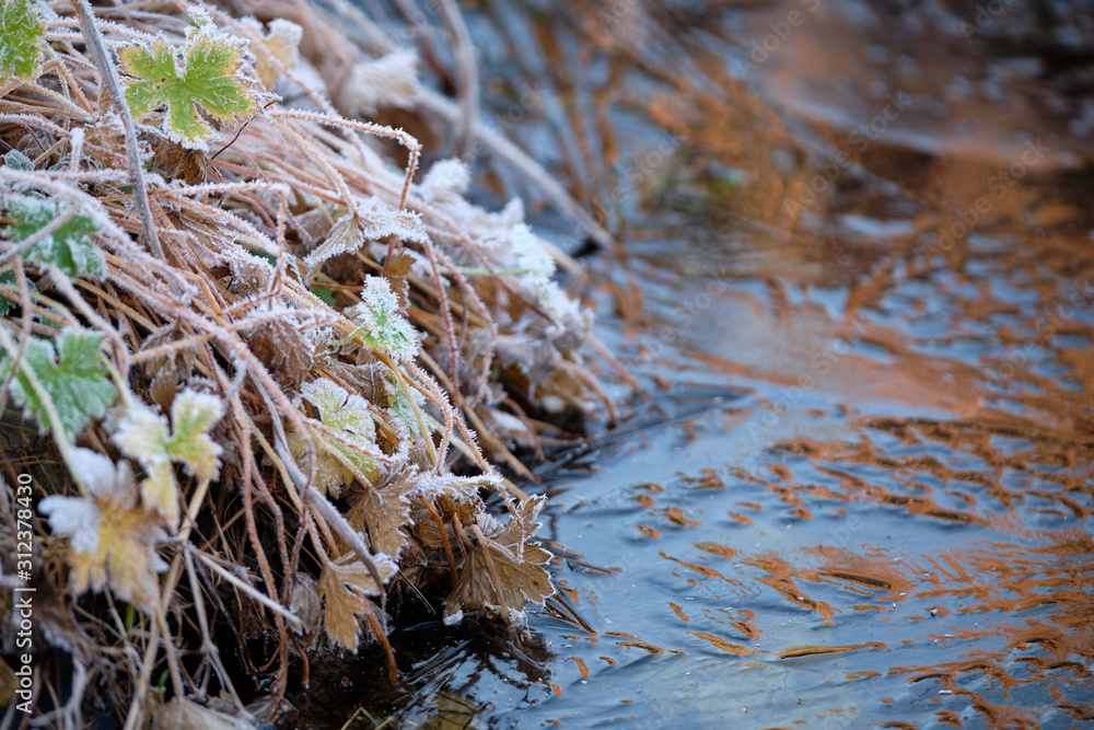 Wall Mural Plants and grass covered with rime at the banks of a garden pond with ice on a cold winter morning