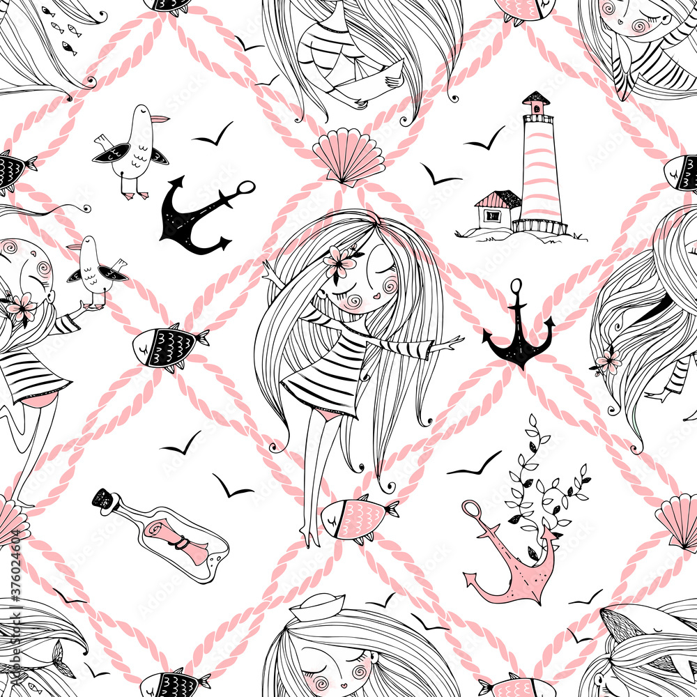 Wall Mural Seamless pattern on the sea theme with cute girls, whales and seagulls in a cute Doodle style
