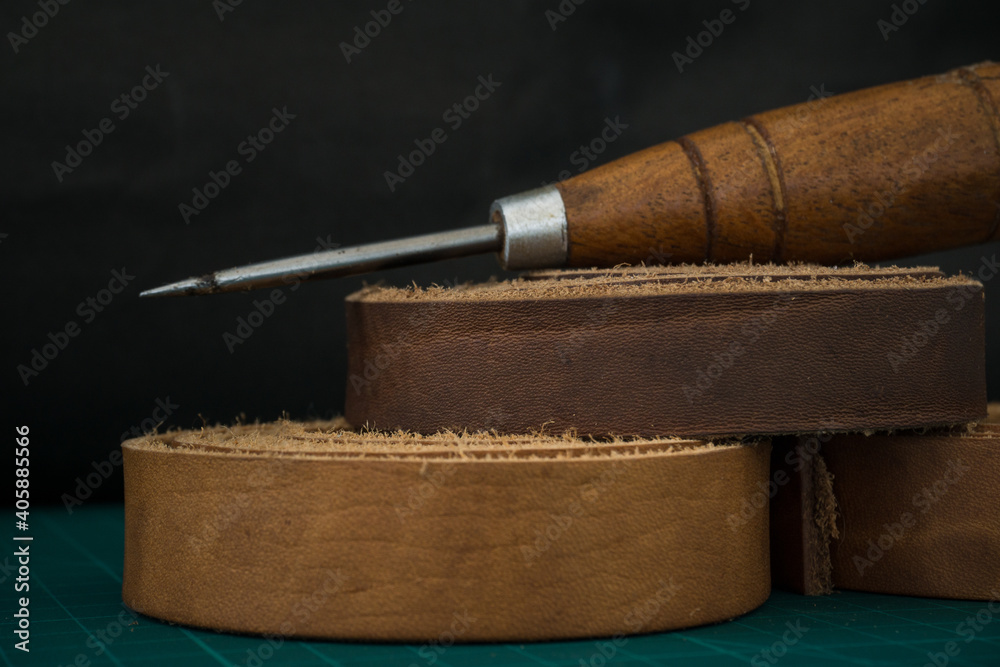 Wall Mural Closeup shot of a wooden stitching awl and genuine leather rolls on a craftsman'