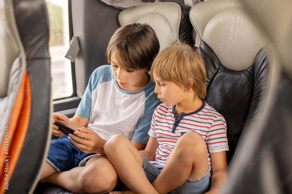 Wall Mural Children, siblings, playing on a mobile phone while traveling with bus on a long