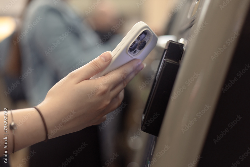 Wall Mural Close-up of a woman paying at a self-service machine using a contactless phone p