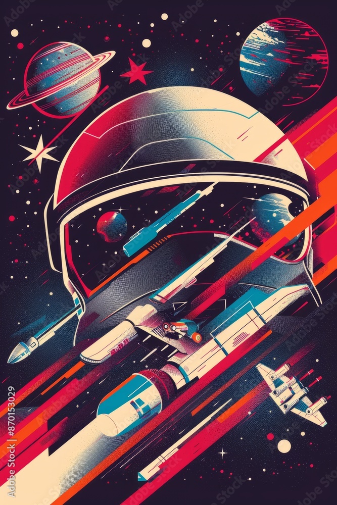 Wall Mural A retro-style illustration of a space helmet with spaceships and planets in the background