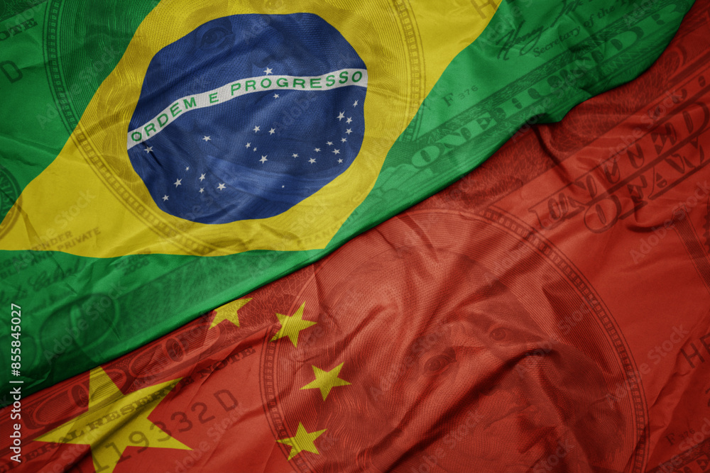 Canvas Print waving colorful flag of brazil and national flag of china on the dollar money background