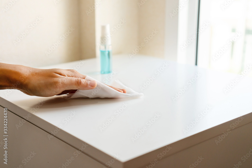 Photography Woman hand cleaning headboard with disinfectant wet wipe and alcohol spray in bedroom at home