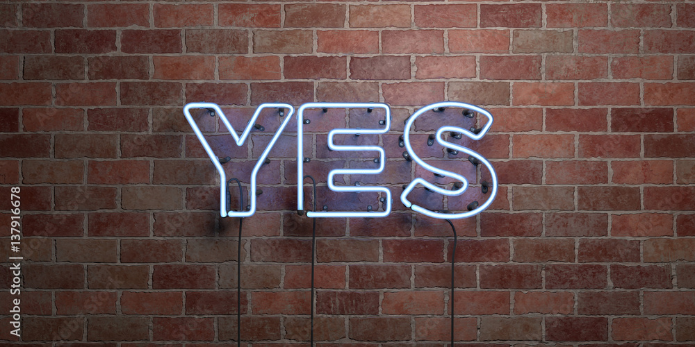 Photography YES - fluorescent Neon tube Sign on brickwork - Front view - 3D rendered royalty free stock picture